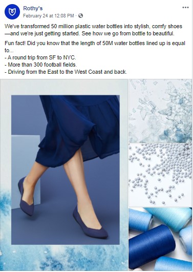 A brand that does a fantastic job of relating their product to their audience’s core values and beliefs is Rothy’s. Their mission is to reduce the amount of waste produced by the apparel industry and create products made from recycled materials. This is a mission that many can get behind and are excited to share these comfy, sustainable shoes with their social networks.