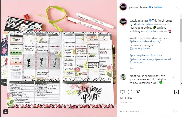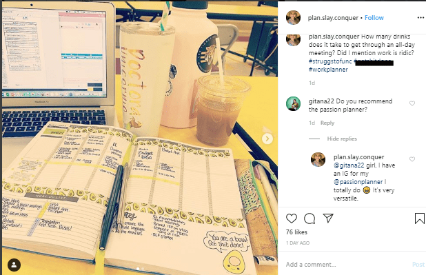 Passion Planner does a great job with consumer engagement. They host a #plannercrushwednesday where they showcase a consumer photo for the week. You’ll notice in the above post that they provide some encouragement which is strengthening the emotional bond while also providing value to their audience. I think it’s unique that they refer to their audience as Pashfam, because once you commit to a Passion Planner, you’re a part of the family. They’ve marketed this term to their advantage and created #pashfam for users to share how they’re using their planner. The screenshot above is the optimal example, someone posted using #pashfam and simply shared what their day looks like with the planner. Now here’s the gold, you’ll notice that in the comments people are curious about the product and the consumer raves about how much she loves it and is able to organically make a recommendation to others.